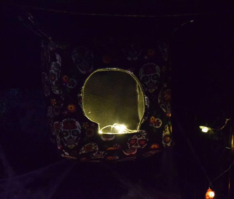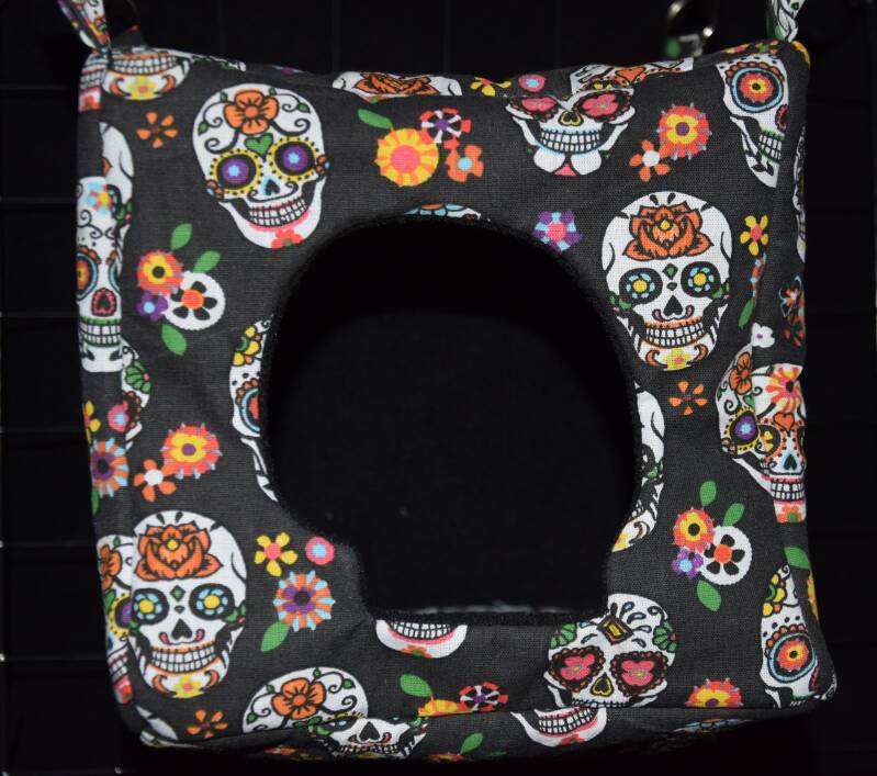 L'intérieur est tapissé de polaire épaisse noire et l'extérieur est en crétonne avec motif de crânes en sucre colorés sur fond noir. Entrée en forme de crâne!