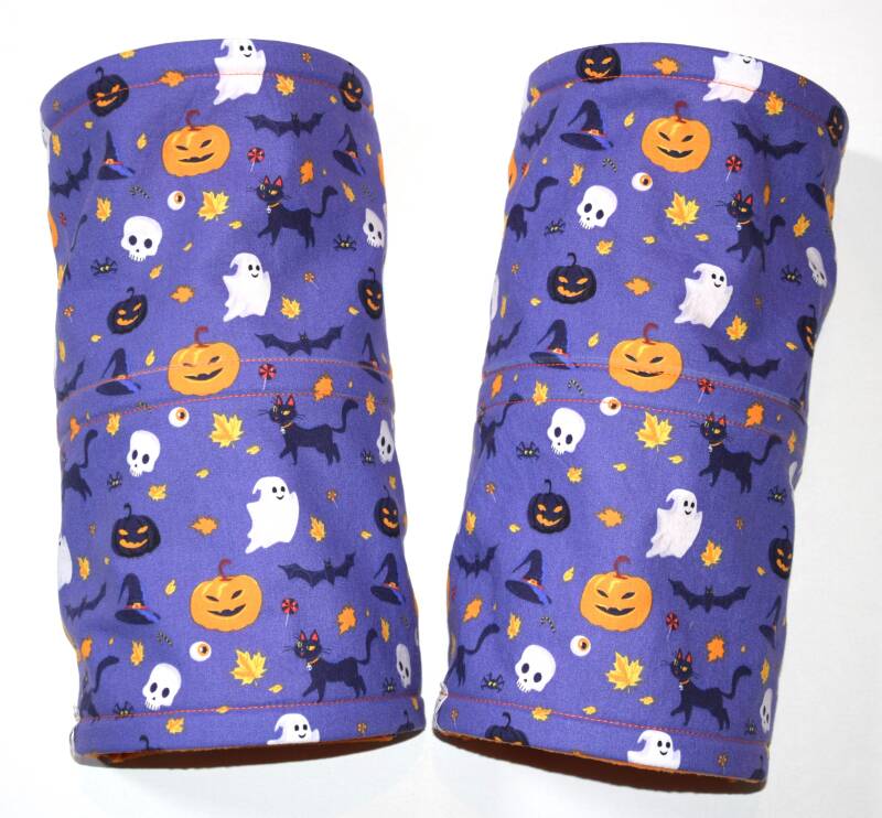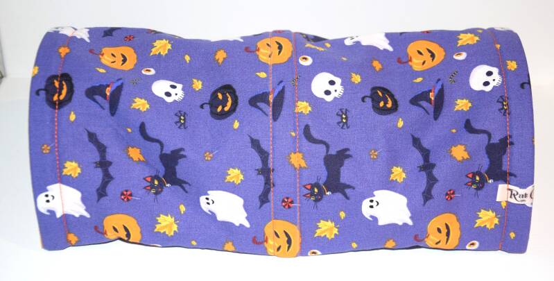 Il est composé d'une face interne en tissu polaire orange citrouille et d'un tissu extérieur avec motifs de sympathiques fantômes, citrouilles grimaçantes, chauves-souris adorables, chats et chapeaux de sorcières sur fond violet.