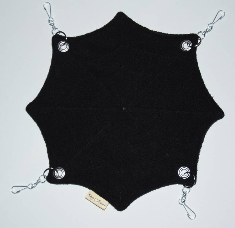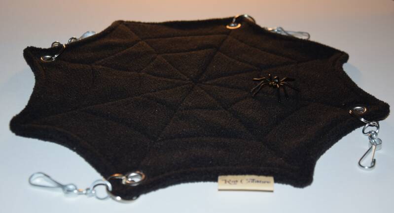 Hamac à un étage de la collection "Halloween 2025", en forme de toile d'araignée et composé de deux faces en tissu polaire noir.